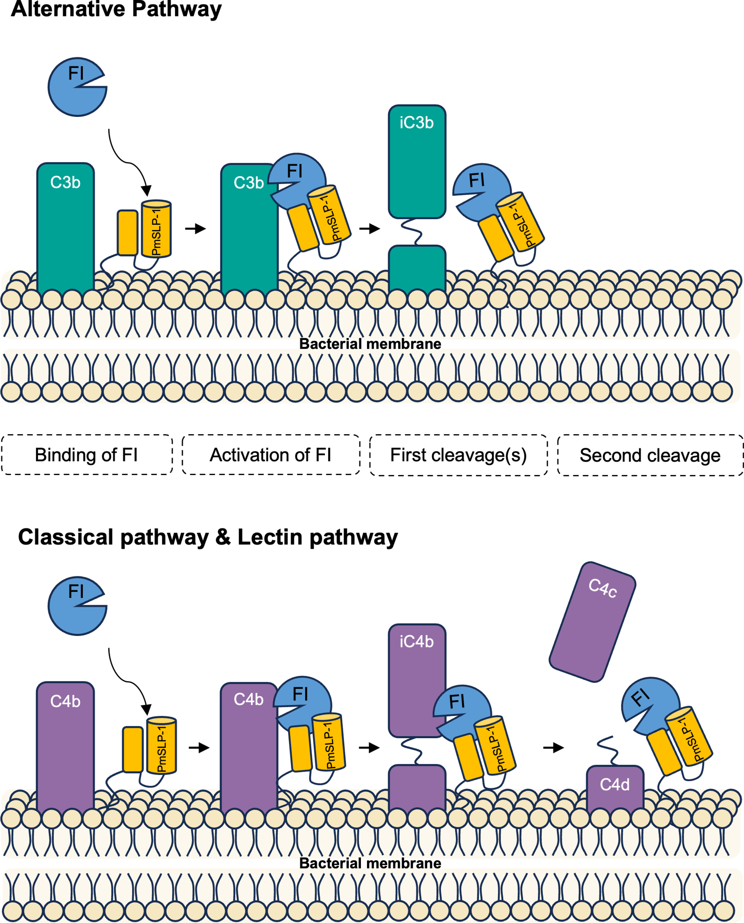 Pasteurella multocida is the leading cause of wound infections in humans following animals’ bites or scratches. This bacterium is also commonly found in the respiratory tract of many mammals and can cause serious diseases resulting in the rapid death of infected animals, especially cattle. To prevent these infections in cattle, a subunit-based vaccine utilizing the surface lipoprotein PmSLP was developed and showed remarkable protection with a single dose administration. Here, we report that PmSLP binds host complement factor I (FI) and facilitates cleavage of complement components C3b and C4b independently of any cofactors (e.g., FH, C4BP), thereby allowing the pathogen to evade host defence. Cryo-EM structure of PmSLP bound to FI reveals that PmSLP stimulates FI enzymatic activity by stabilizing the catalytic domain. This is the first time that a bacterial protein has been shown to directly activate FI independent of complement cofactors and target all arms of the complement cascade.